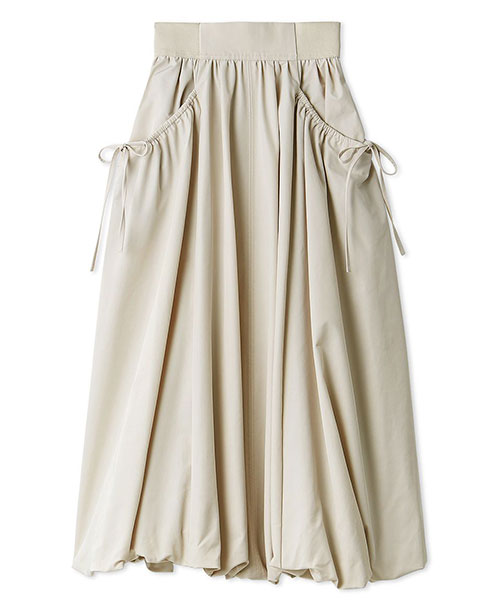 程よいハリ感と柔らかさのあるポリエステル生地をバルーンシルエットで仕立ててふんわりボリューム感を出したウエストゴムバルーンスカートが届きました。程よいボリュームのあるシルエットで、体型カバー力も抜群。光沢感を抑えた生地で華やかながら落ち着いた印象です。サイドにはドロストリボンを配置し、ギャザーを入れてフェミニンさをプラス。ふんわとしたバルーンシルエットに対してウエストベルトのサイド部分にはゴムをプラスして、スポーティー感を加えトレンドライクな仕上がりに。後ろのファスナーで着脱いただけます。