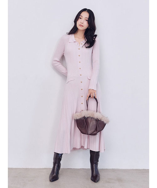 フロントに配置したデザインの入ったゴールドメタルボタンがリュクスな印象の、シルエットにこだわってお作りしたSNIDEL定番人気のフロントボタンニットワンピースが届きました。襟付きで今季らしいトラッドな雰囲気が目を惹きます。表情のあるランダムリブニットを使用。ウエスト部分はすっきりと見えるように2×1の細リブに切り替え、ひざ下からはフレアラインになるようにリブ目をマチ状に入れてシルエットを作りました。スタイルアップして見えるように、ウエストリブ位置を高めに設定しているのもポイントです。ワンポイントのフラップポケットはシルエットを重視してフェイクになっています。フロントのボタンは上2つ、下3つは本開きになっており、ボタンを外して抜け感をプラスした着こなしも可能です。