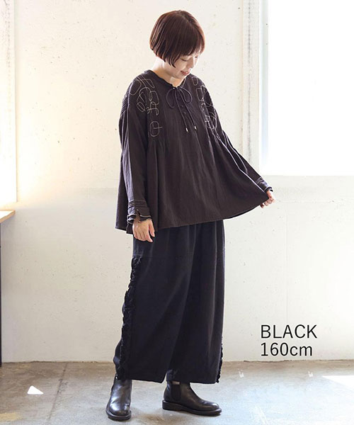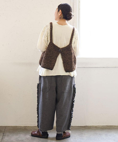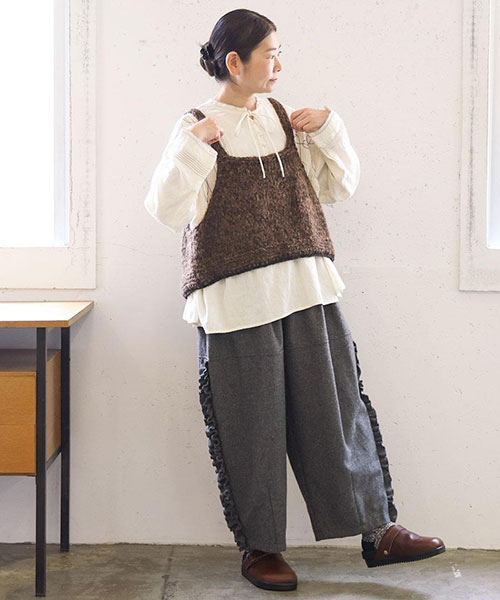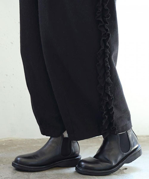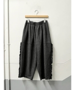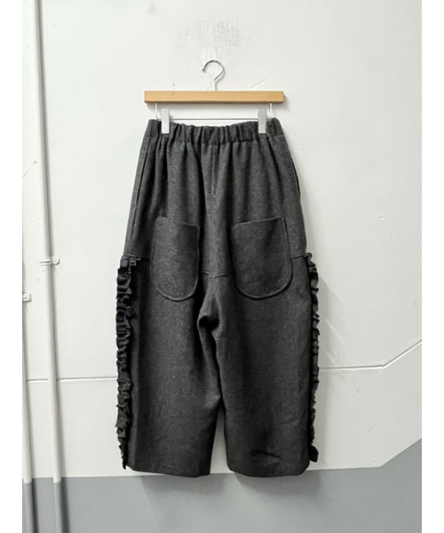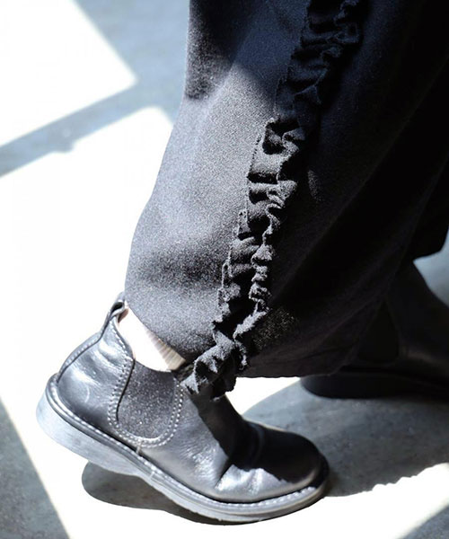 フリルを効かせた、遊び心のある大人のためのデザインワイドパンツ。