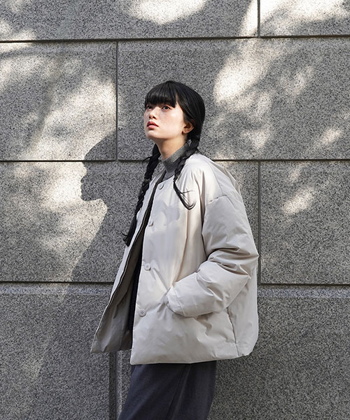 すっきりとした印象のノーカラーデザインで、タートルネックやマフラーとのレイヤードも楽しめます。