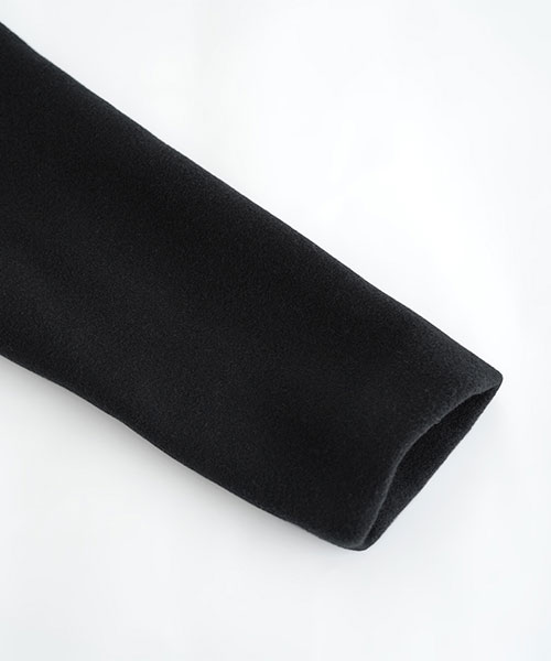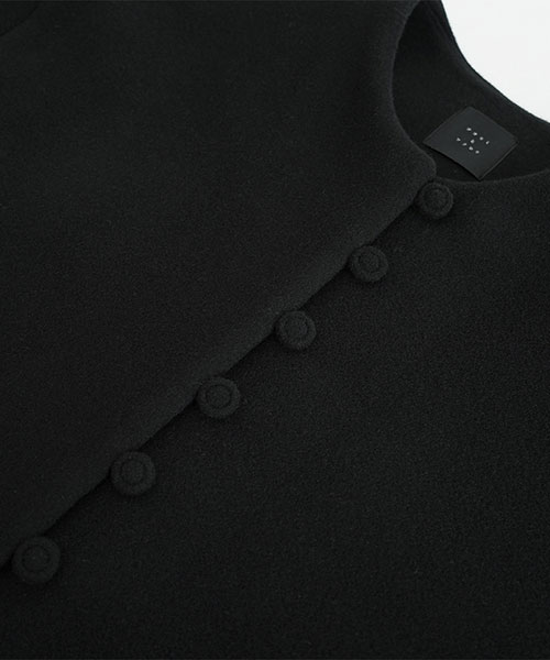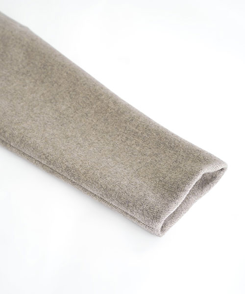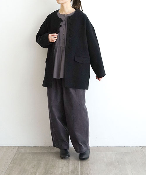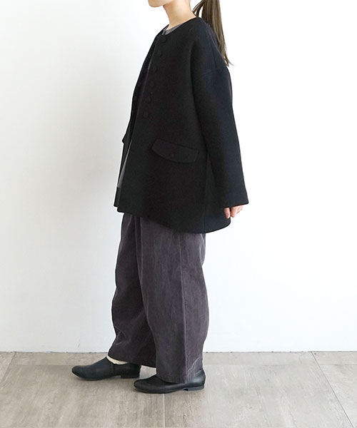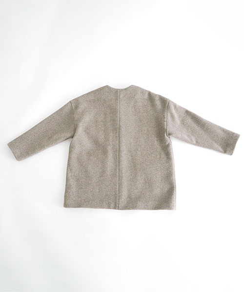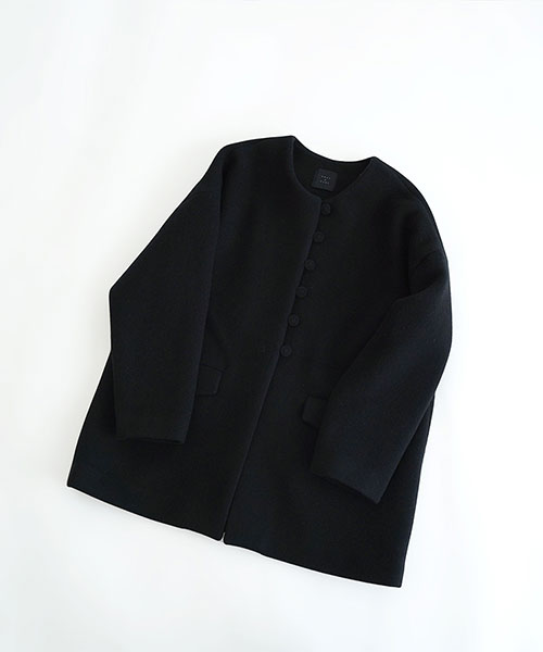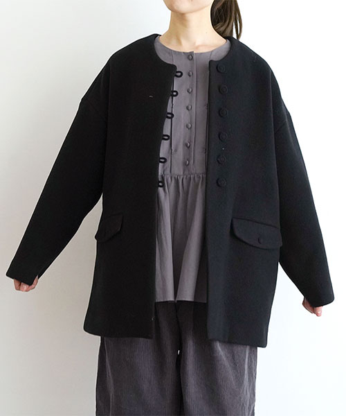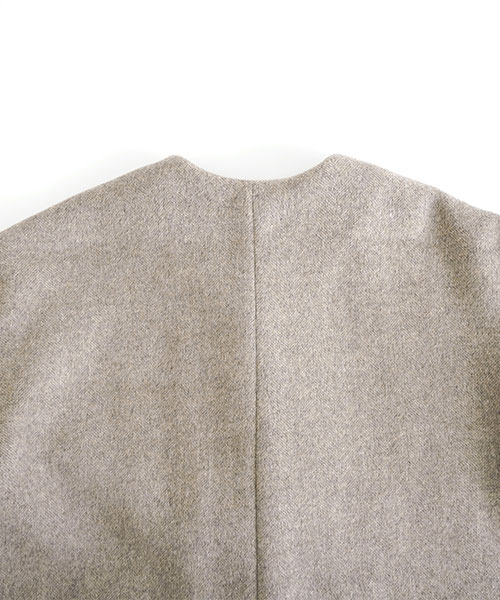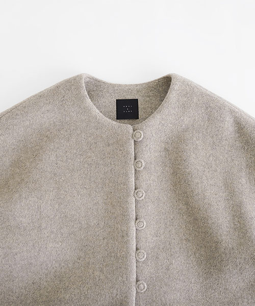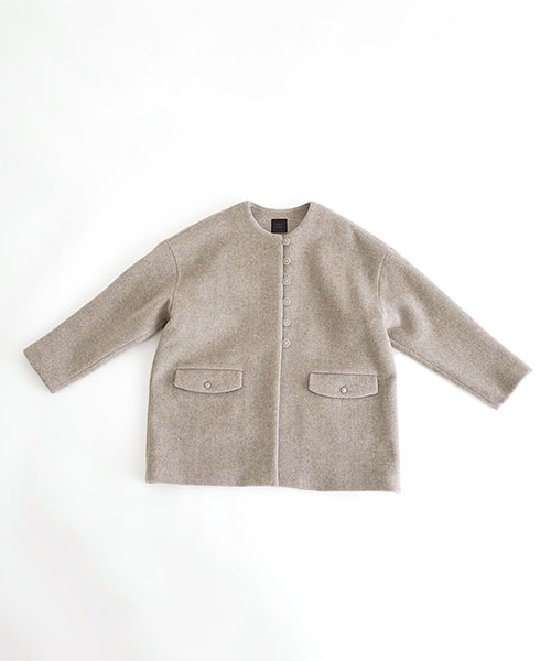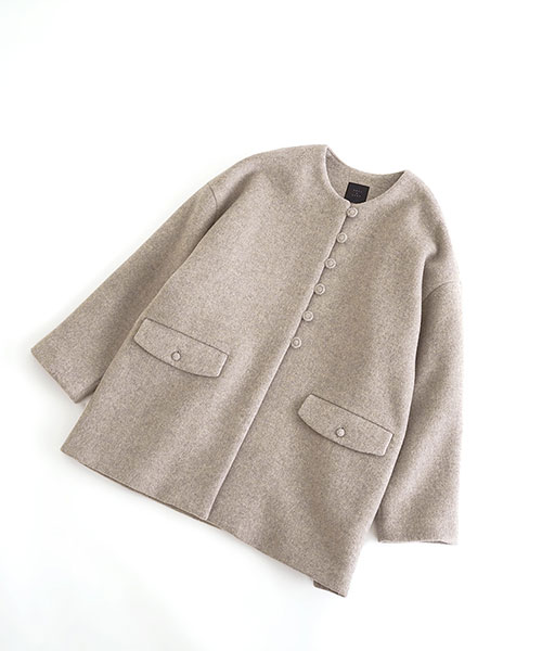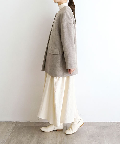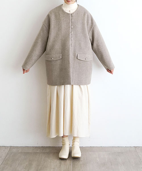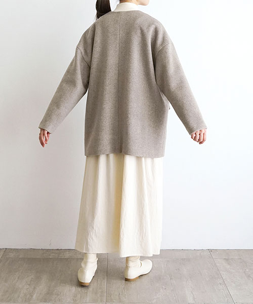 やわらかなウール素材で仕立てた、ノーカラーのミドル丈コート。