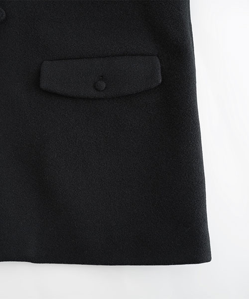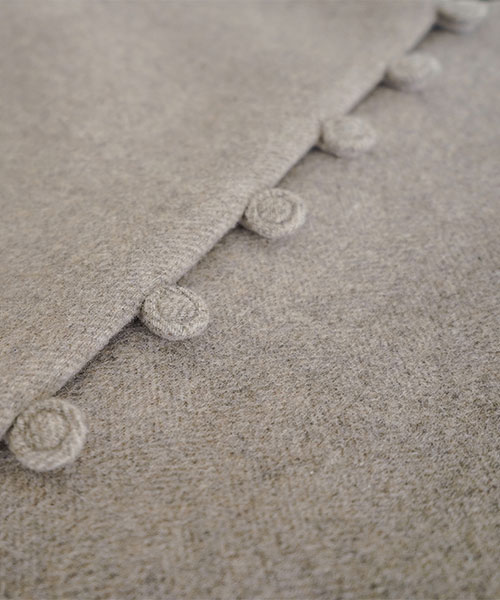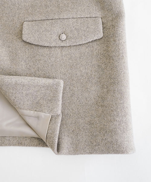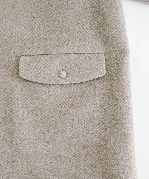 ドロップショルダーのゆったりとしたシルエットでお作りしており、くるみボタンとフラップポケットがアクセントに。