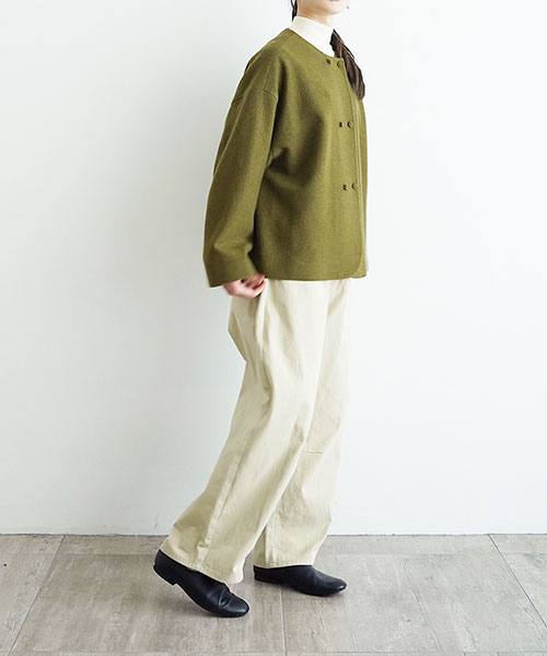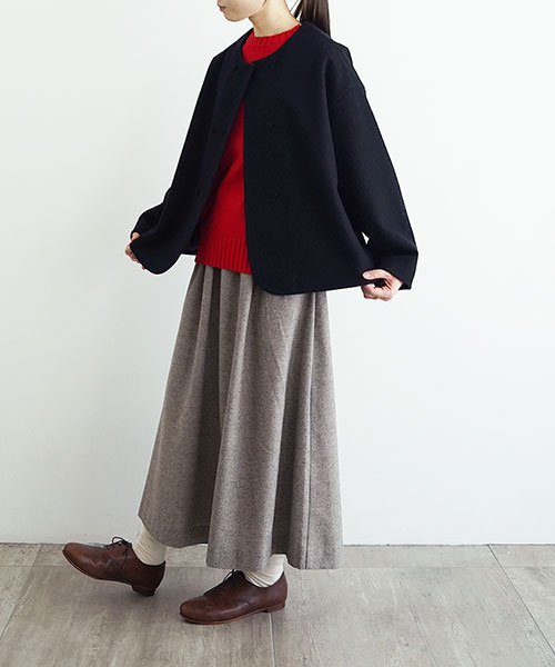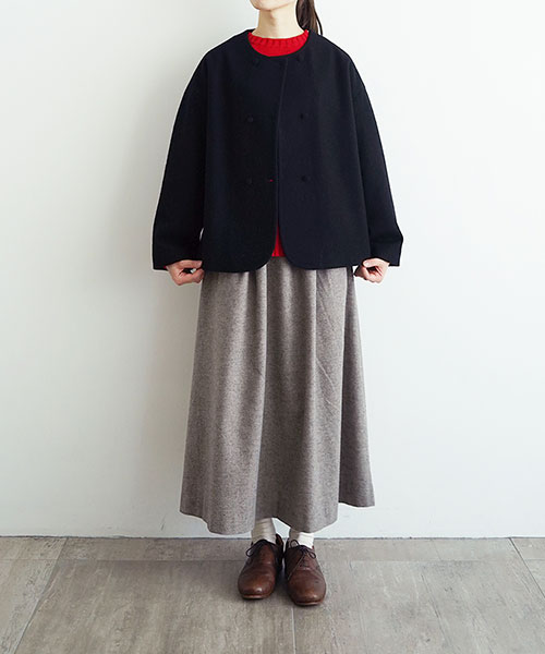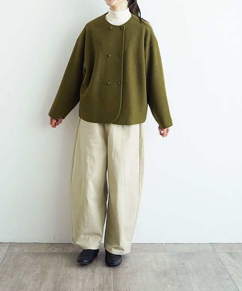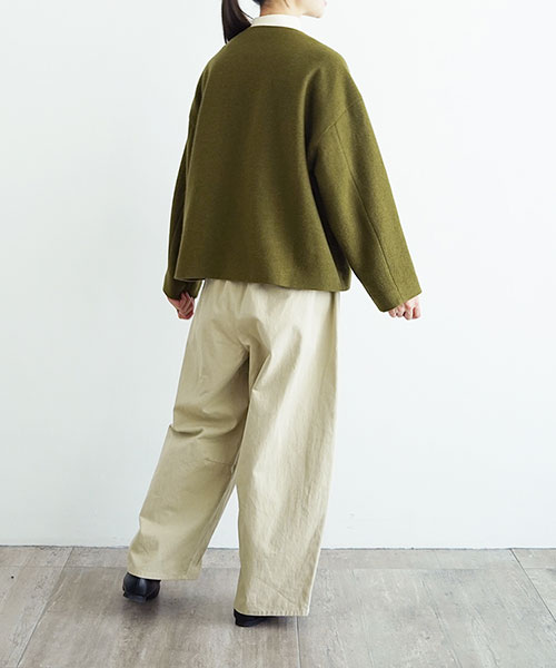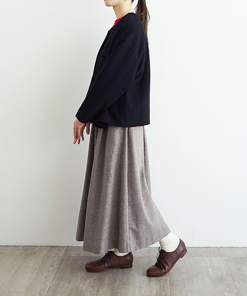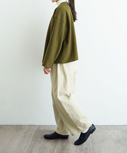 身幅にゆとりがあり、ふんわりブラウスやニットとの重ね着も安心です。