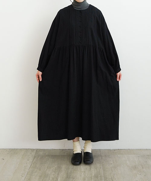 ウエストの切り替えからはたっぷりとギャザーが施されており、風にふんわりなびくシルエットに。